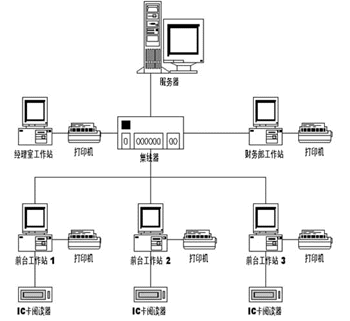 系統(tǒng)由IC卡閱讀器、工作站、服務(wù)器、打印機、相應(yīng)網(wǎng)絡(luò)及管理軟件組成。由工作站接收IC卡閱讀器的客戶數(shù)據(jù)并輸入消費業(yè)務(wù)數(shù)據(jù),通過網(wǎng)絡(luò)保存到服務(wù)器。