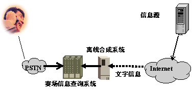 離線合成系統(tǒng)在用戶電話呼入前,將需要播放的文本信息預(yù)先轉(zhuǎn)換成語音文件存放在系統(tǒng)中,當(dāng)電話用戶呼入系統(tǒng)后,系統(tǒng)直接向用戶播放事先生成的語音文件。離線合成方式適用于作賽事快報(bào)、明星風(fēng)采、賽場花絮等公共信息類信息服務(wù)。