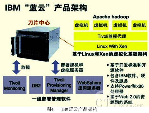 通過IBM的技術白皮書,我們可以一窺藍云計算平臺的內(nèi)部構造。“藍云”建立在IBM大規(guī)模計算領域的專業(yè)技術基礎上,基于由IBM軟件、系統(tǒng)技術和服務支持的開放標準和開源軟件。簡單地說,“藍云”基于IBM Almaden研究中心(Almaden Research Center)的云基礎架構,包括Xen和PowerVM虛擬化、Linux操作系統(tǒng)映像以及Hadoop文件系統(tǒng)與并行構建!八{云”由IBM Tivoli軟件支持,通過管理服務器來確;谛枨蟮淖罴研阅。這包括通過能夠跨越多服務器實時分配資源的軟件,為客戶帶來一種無縫體驗,加速性能并確保在最苛刻環(huán)境下的穩(wěn)定性。IBM新近發(fā)布的“藍云(Blue Cloud)”計劃,能夠幫助用戶進行云計算環(huán)境的搭建。它通過將Tivoli、DB2、WebSphere與硬件產(chǎn)品(目前是x86刀片服務器)集成,能夠為企業(yè)架設一個分布式、可全球訪問的資源結構。根據(jù)IBM的計劃,首款支持Power和x86處理器刀片服務器系統(tǒng)的“藍云”產(chǎn)品將于2008年正式推出,并且計劃隨后推出基于System z“大型主機”的云環(huán)境,以及基于高密度機架集群的云環(huán)境。