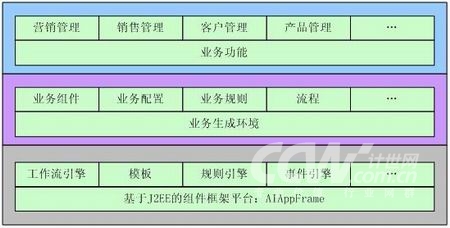 從總體上看AIOpenCRM定位為一個(gè)業(yè)務(wù)生成平臺(tái),它分為三個(gè)部分,一個(gè)基于各種中間件(AIAppFrame、WorkFolw、BusinessRule等)實(shí)現(xiàn)的業(yè)務(wù)生成環(huán)境,第二個(gè)是基于業(yè)務(wù)邏輯數(shù)據(jù)模型實(shí)現(xiàn)的業(yè)務(wù)對(duì)象,最后是基于業(yè)務(wù)生成環(huán)境以及業(yè)務(wù)對(duì)象實(shí)現(xiàn)的業(yè)務(wù)功能。它們都是基于J2EE技術(shù)進(jìn)行實(shí)現(xiàn)的。如下圖所示: