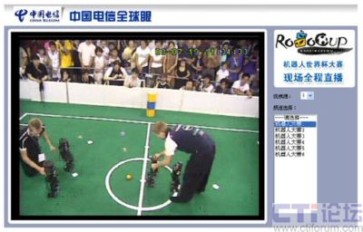 根據(jù)本次比賽的需要,中國電信蘇州分公司首次利用自身業(yè)務(wù)優(yōu)勢(shì)為RoboCup機(jī)器人足球世界杯賽官方網(wǎng)站提供了全球網(wǎng)絡(luò)視頻直播。觀眾在家,通過IE瀏覽器登錄蘇州獨(dú)墅湖高教區(qū)首頁并進(jìn)入“RoboCup2008機(jī)器人世界杯賽官方網(wǎng)站全球眼視頻直播”系統(tǒng),就可以輕輕松松觀看標(biāo)準(zhǔn)平臺(tái)組、類人組、小型組、中型組、青少年組和家庭機(jī)器人組的比賽實(shí)況。