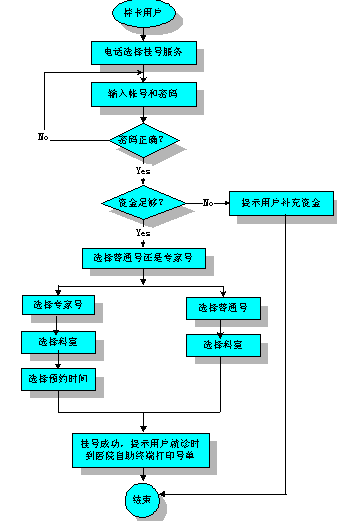 用戶選擇普通門診,系統繼續(xù)提示"請選擇科目,1內科,2外科,3五官科,……,"用戶選擇完畢。系統提示:"您要掛的是*科,確認按1,重輸按2",用戶按1,系統繼續(xù)提示:"本院已經為您記錄并生成號單,請于當日及時到醫(yī)院自助終端打印號單后就診。"