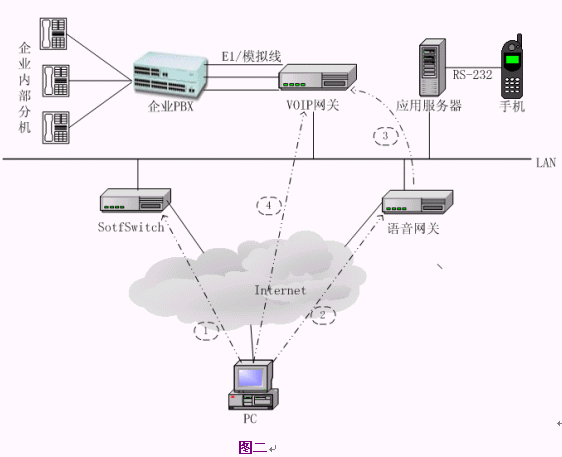 用戶使用系統(tǒng)時(shí),需要先下載終端并安裝到PC上,然后在終端上撥企業(yè)內(nèi)部的分機(jī)號(hào)碼就可以了。對(duì)于一般的企業(yè),VoIP語(yǔ)音網(wǎng)關(guān)可以配置幾條模擬線到一個(gè)E1的規(guī)模,SoftSwitch、語(yǔ)音網(wǎng)關(guān)、應(yīng)用服務(wù)器可以安裝在一臺(tái)PC或PC服務(wù)器上,或者與企業(yè)的其它服務(wù)器(如代理服務(wù)器)合用,另外需要一到兩個(gè)公網(wǎng)IP地址資源。系統(tǒng)的硬件和網(wǎng)絡(luò)成本非常低,整個(gè)系統(tǒng)如果按一個(gè)E1(30路)容量計(jì)算,配置VoIP網(wǎng)關(guān)和一臺(tái)PC服務(wù)器,硬件價(jià)格不超過3萬元,如果VoIP網(wǎng)關(guān)支持隧道模式傳送信令和語(yǔ)音,則語(yǔ)音網(wǎng)關(guān)也可以省去。