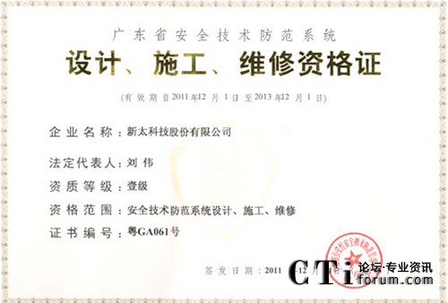 CTI論壇(ctiforum)1月31日消息(記者 浩宇):近日,新太科技股份有限公司再傳喜訊,公司順利通過廣東省公安廳認定的“廣東省安全技術(shù)防范系統(tǒng)設(shè)計、施工、維修一級資格證”換證審核,成功獲得新證書。此次新太科技資質(zhì)認證的通過,是新太科技公司全體員工通過兩年的不斷努力得到的豐碩成果,她不僅體現(xiàn)了新太科技安防技術(shù)等級在行業(yè)內(nèi)處于領(lǐng)先的優(yōu)勢,同時也體現(xiàn)出新太科技的管理和服務(wù)水平實現(xiàn)了行業(yè)內(nèi)的完美延續(xù)。