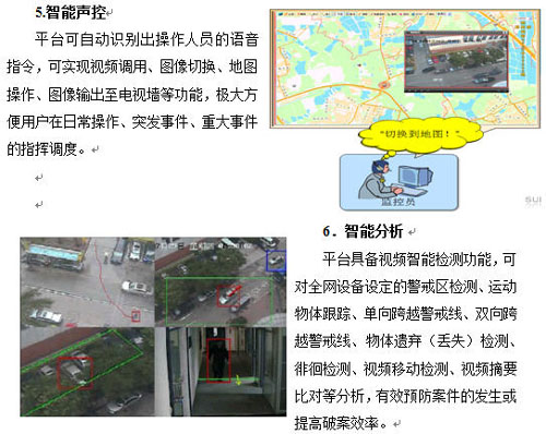 由于海量視頻信息的出現(xiàn),要求平臺能利用智能視頻技術來解決傳統(tǒng)視頻監(jiān)控系統(tǒng)所無法解決的問題。如智能檢索、人臉識別、車牌識別、運動軌跡跟蹤、行為模式分析等,變“被動監(jiān)控”為“主動監(jiān)控”,以提升視頻監(jiān)控系統(tǒng)的應用成效,降低管理成本。