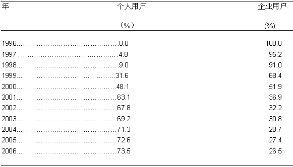 圖三表示出美國DSL市場企業(yè)和個(gè)人用戶所占的比例。在1999年以前,企業(yè)用戶占了這個(gè)市場的絕大部分,這一時(shí)期服務(wù)商提供的主要是針對(duì)企業(yè)用戶的HDSL服務(wù)。而從1999年以后隨著ADSL技術(shù)的成熟和普及,個(gè)人用戶正在成為市場上的主力軍。1999年,個(gè)人DSL用戶僅占總用戶數(shù)的31.6%, 企業(yè)用戶,主要是中小企業(yè)用戶占DSL總用戶數(shù)的68.4%。而到了2000年,美國市場上48.1%的DSL用戶為家庭用戶,企業(yè)用戶的比例下降為51.9%。Frost & Sullivan預(yù)測,到2006年,73.5%的DSL用戶將是個(gè)人家庭用戶,企業(yè)用戶將僅為26.5%。