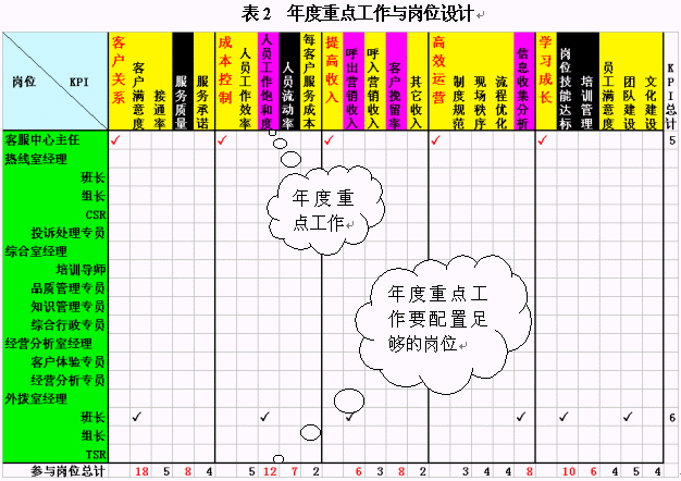在這里,我們先以崗位設(shè)計來舉例。經(jīng)常有呼叫中心主管把每個崗位的職責(zé)都設(shè)計的非常詳細(xì),包括了每天來做什么,說什么,錄入什么,甚至是打掃某區(qū)域衛(wèi)生之類。但是,我看遍了每一條,也沒找到這個崗位應(yīng)該對什么業(yè)績"負(fù)責(zé)任",該對哪些工作做出貢獻(xiàn)。此處建議各位把效益評價體系、年度重點工作與崗位設(shè)計結(jié)合起來。如表2所示,我們可以把效益評價體系作為KPI放在橫坐標(biāo)中,而崗位設(shè)置則是縱坐標(biāo)。每個崗位對應(yīng)的行中,可以勾畫其應(yīng)負(fù)責(zé)或者做出主要貢獻(xiàn)的項目。這些項目不能超過6個,因為太多的項目會使得這個崗位無所適從,最終的結(jié)果是哪個也沒做好。當(dāng)你勾畫完成之后,請計算每列的"對勾"數(shù)目,看看你本年度的重點工作是不是有較多崗位負(fù)責(zé)呢?