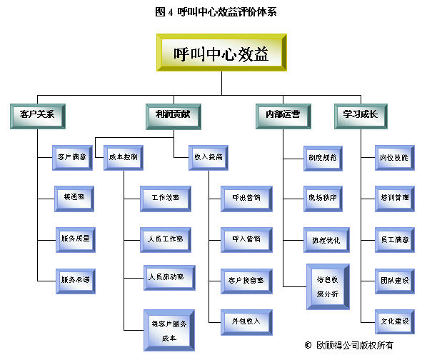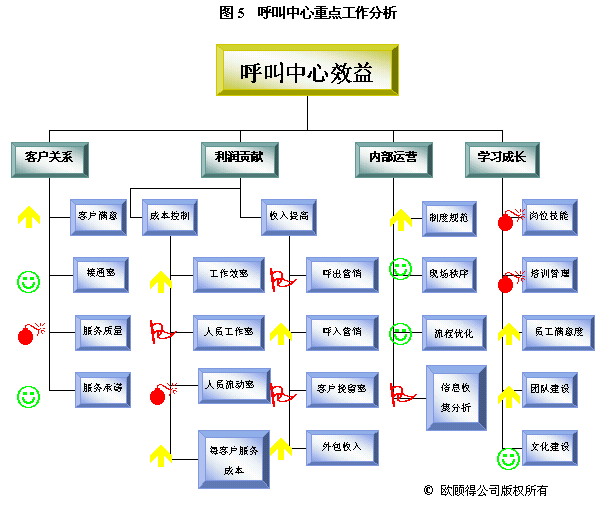 根據(jù)年度重點工作及目標(biāo),我們就可以設(shè)計關(guān)鍵措施來使其實現(xiàn)。通常一項關(guān)鍵措施可以有助于幾個目標(biāo)的達(dá)成。如建立培訓(xùn)體系,可以使得在崗培訓(xùn)、上崗培訓(xùn)、多技能訓(xùn)練以及崗位技能達(dá)標(biāo)率有所提升,而體現(xiàn)在業(yè)務(wù)上的效果則是服務(wù)質(zhì)量的提升、呼出營銷收入增加和客戶挽留率提高。