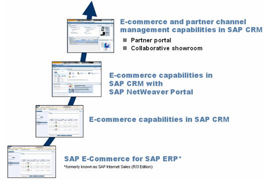 從上圖中,我們可以清楚地看出SAP的電子商務(wù)(E-Commerce)功能經(jīng)歷了一個不斷進化的過程。主要分成以下四個階段: