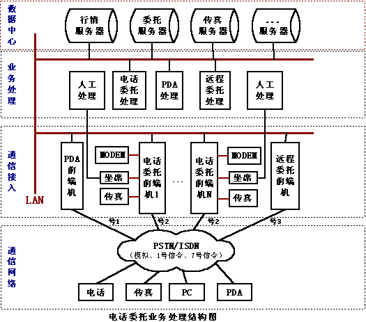 第一種方案是在證券營(yíng)業(yè)部加專(zhuān)用的前端機(jī)和處理機(jī),申請(qǐng)獨(dú)立的電話(huà)線(xiàn)路來(lái)處理PDA的委托,PDA和營(yíng)業(yè)部前端機(jī)采用雙向或單向的DTMF收發(fā)的方式完成通訊。根據(jù)市場(chǎng)的情況來(lái)看,這種方式不容易被證券營(yíng)業(yè)部和股民接受,證券營(yíng)業(yè)部要申請(qǐng)一定數(shù)量的電話(huà)線(xiàn)路,和證券電話(huà)委托的線(xiàn)路不能共用,增加了營(yíng)業(yè)部的費(fèi)用。由于線(xiàn)路的限制,股民在做委托查詢(xún)時(shí)往往出現(xiàn)線(xiàn)路阻塞等情況,另外DTMF通訊方式的有速度慢,信息容量有限,抗干擾性差等缺點(diǎn),股民不容易接受。目前東方潮公司的“東方獵人”的委托就是采用這種方式。