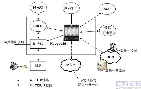 東進Keygoe系列多媒體交換機通過高密度7號信令鏈路支持、大容量的時隙交換、多網(wǎng)絡接口和語音處理完成不同業(yè)務系統(tǒng)的7號信令的接續(xù)和解析、話音交換和協(xié)議轉(zhuǎn)換。對于已經(jīng)進行固網(wǎng)智能改造的電信網(wǎng)絡,可以在匯接局將各種業(yè)務平臺連接至東進Keygoe系列多媒體交換機,并通過東進Keygoe系列多媒體交換機連接至SHLR,實現(xiàn)多業(yè)務平臺上的多業(yè)務觸發(fā),同時通過SHLR與97系統(tǒng)以及其他業(yè)務支撐系統(tǒng)連接起來,實現(xiàn)業(yè)務的統(tǒng)一批價、鑒權和計費;對于沒有進行固網(wǎng)智能化改造的電信網(wǎng)絡,可以在匯接局通過東進Keygoe系列多媒體交換機和SSP提供基于TCP/IP層面的業(yè)務平臺互聯(lián)。
