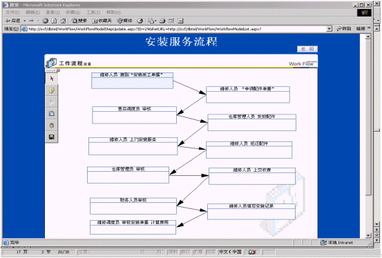工作流程是指企業(yè)或公司的某種工作按照特定規(guī)范的流程在計算機上實現(xiàn)流轉(zhuǎn)的過程,工作流程由步驟、行為、行為處理、崗位的設(shè)置、權(quán)限設(shè)置等基本元素組成,主要對維修和回訪的流程進行管理。