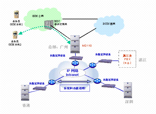 為降低通信成本,提高辦公效率,愛立信及其合作伙伴利用客戶原有數(shù)據(jù)專網(wǎng),擴充帶寬,用2M 專線將其14個分支機構和廣州黃埔總部連接起來,并用語音交換機替換原直線電話,使該2M的寬帶同時傳輸數(shù)據(jù)和語音(構建公司內(nèi)部VPN),形成了公司的VoIP專網(wǎng). 同時,在公司總部, 用愛立信MD110替換原有交換機,并與廣東移動直接相連,總部配180個設定不同的權限級別的ME(移動分機),使經(jīng)常在外辦理業(yè)務的人員的手機號被注冊為總部交換機的一個移動分機。廣東移動為所有移動分機提供特殊價格。