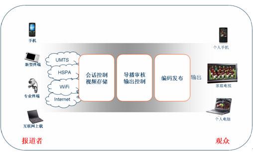 如今手機(jī)能拍照、攝像并不稀奇,攝像頭幾乎成了手機(jī)的標(biāo)準(zhǔn)配置,視頻通話也是3G特色業(yè)務(wù)之一,但要把手機(jī)拍攝的圖像實時回傳到電視臺,并合理地發(fā)送到直播節(jié)目中卻還需要打通很多環(huán)節(jié)?偟膩碚f,電視臺需要的是一個業(yè)務(wù)控制平臺,使后臺導(dǎo)播人員能監(jiān)控、審核手機(jī)回傳的多路視頻信號,根據(jù)需要選取其中的合適內(nèi)容插入到直播節(jié)目中,同時系統(tǒng)還應(yīng)該能夠根據(jù)需求同時輸出各種格式的視頻,發(fā)布到電視頻道、互聯(lián)網(wǎng)或者手機(jī)電視中。