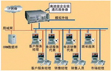 * 小型呼叫中心:座席數(shù)目在50個(gè)以下。投資一般在50萬元以下。這種系統(tǒng)結(jié)構(gòu)與第二種類似,但使用較小型PBX,或用板卡代替,業(yè)務(wù)代表座席、應(yīng)用服務(wù)器及數(shù)據(jù)庫大小在量上均作相應(yīng)減少,它主要適合中小型企業(yè)的業(yè)務(wù)需要。