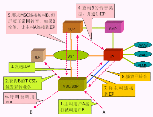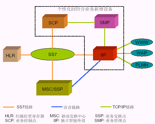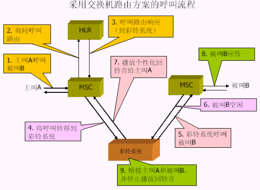 1. 交換機(jī)方式對現(xiàn)有的移動(dòng)交換機(jī)進(jìn)行了流程改造,并添加了彩鈴智能外設(shè)進(jìn)行業(yè)務(wù)流程控制和業(yè)務(wù)數(shù)據(jù)維護(hù)