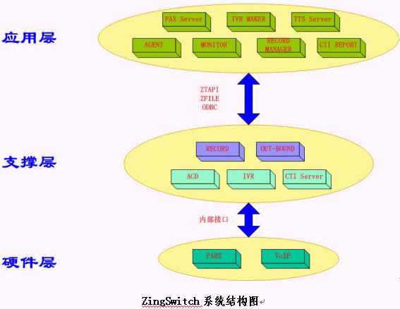 在以上三層結構中,前兩層與具體業(yè)務系統(tǒng)無關。上層業(yè)務系統(tǒng)的多種變化,不會影響下層的穩(wěn)定;而下層規(guī)范地進行優(yōu)化和擴展后,上層的所有應用都可在業(yè)務功能上得到擴展。這樣,用戶的業(yè)務應用系統(tǒng)自身可以有多種功能和性能的變動和擴展,同時,當基于ZingSwitch一體化交換機的呼叫中心系統(tǒng)平臺在進行擴容、升級的時候,原來已經(jīng)無縫掛接其上的用戶的業(yè)務應用系統(tǒng)也無需任何更改即可運行。