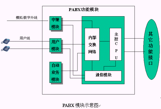 PABX模塊采用了三級分布分散的控制方式,這三級由主控板級、通訊控制級和各功能模塊級組成。各功能模塊單板實現(xiàn)各功能板的自身控制,通訊控制級模塊主要負責主控板級和各功能模塊級之間的數(shù)據(jù)通訊,實現(xiàn)主控板對各功能模塊的協(xié)調和控制。模塊內(nèi)部采用了先進的內(nèi)存管理技術、先進的通信方式和先進的控制方式,因而獲得了極高的CPU通訊帶寬和處理能力。