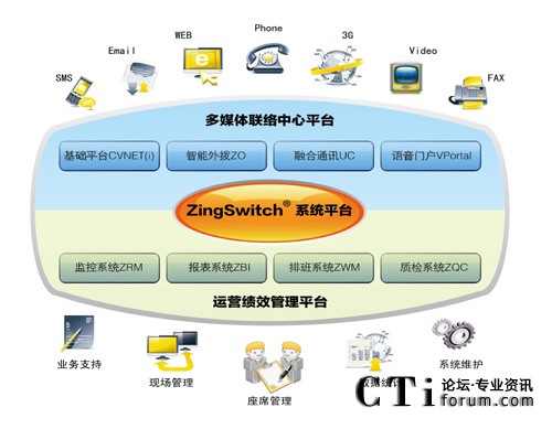 ZingSwitch® CVNET(i)基于ZingFramework®架構(gòu)幫助企業(yè)建立一個(gè)完全融合支持全業(yè)務(wù)接入的一體化聯(lián)絡(luò)中心,其產(chǎn)品線涵蓋PBX、ACD、CTI、IVR、REC、智能外撥ZO、融合通信UC、語音門戶VPortal等核心模塊,通過SOA統(tǒng)一服務(wù)為企業(yè)提供一個(gè)安全、穩(wěn)定、大容量、功能完備、可擴(kuò)展,并且貼合業(yè)務(wù)需求的無縫集成平臺(tái)。