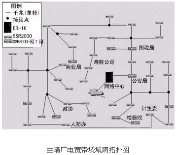 根據(jù)實際情況,網(wǎng)絡(luò)建設(shè)采取分期建設(shè)的方法,網(wǎng)絡(luò)范圍主要包括一個傳輸網(wǎng)(IP骨干網(wǎng))和一個接入網(wǎng)。骨干傳輸網(wǎng)以市政府機房為核心,配置1臺ER-16,而二級機房以Smart Swtich Router2000以千兆光纖接入。