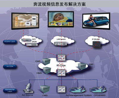 UT斯達(dá)康緊跟市場發(fā)展趨勢和運(yùn)營商步伐,深入研究戶外液晶廣告業(yè)務(wù)的發(fā)展、大力推進(jìn)廣告平臺的研發(fā)。2006年,UT斯達(dá)康推出了奔流(RollingStream)視頻信息發(fā)布解決方案(如圖2所示)。奔流視頻信息發(fā)布解決方案是以奔流(RollingStream)IPTV平臺為基礎(chǔ),結(jié)合戶外液晶廣告市場需求,融合運(yùn)營商以視頻為主的綜合信息發(fā)布的需求,真正運(yùn)營級的電信級解決方案。該方案可以幫助運(yùn)營商實(shí)現(xiàn)融合信息服務(wù)和廣告業(yè)務(wù)的統(tǒng)一運(yùn)營,幫助運(yùn)營商開展兼具公益性和盈利性的信息發(fā)布業(yè)務(wù),運(yùn)營商在推進(jìn)社會信息化、造福公眾的同時(shí),通過視頻廣告的運(yùn)營,也能獲取盈利。該方案基于電信級平臺的穩(wěn)定性、安全性、擴(kuò)展性設(shè)計(jì)要求,可支持百萬級大規(guī)模部署能力,可提供電信級質(zhì)量保證的服務(wù);該方案基于IP流媒體技術(shù),可通過IP網(wǎng)絡(luò)實(shí)時(shí)、精準(zhǔn)、互動地投放廣告內(nèi)容,從而可以支持豐富、新穎的廣告運(yùn)營模式;該方案基于數(shù)字多媒體技術(shù),除了可以發(fā)布視頻廣告,還可以發(fā)布圖片、文字、消息等廣告內(nèi)容。