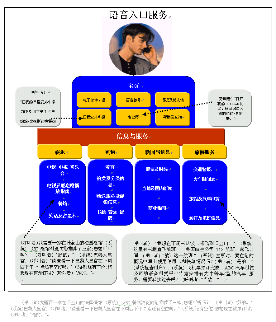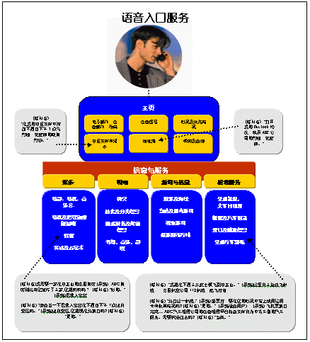 語音網最吸引人之處就在于它可以在一次通話中,同時處理多個任務。下圖表明一名商務人員是如何安排好與一個未來的商務旅行有關的一系列任務的。他獲取了對自己有用的信息,順利達成了一項語音商務交易,接收個人信息和辦公室的幫助,并撥打電話所有這些都是在一個同步過程中完成的。
