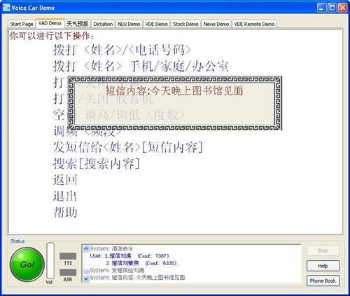 Nuance:可以修改。到你需要修改的那個(gè)“見(jiàn)”上,你再說(shuō)“見(jiàn)”或者見(jiàn)面,它就給你弄過(guò)來(lái)了。但是我們覺(jué)得在中國(guó)區(qū),在中文的修改上,這未必可能是個(gè)好辦法,我們也在試探另外一種辦法,這個(gè)辦法我現(xiàn)在可以給大家介紹一下。就是這樣,我要說(shuō)修改,那么那個(gè)語(yǔ)音合成TS就開(kāi)始給你再讀,剛才不是讀了一遍嗎,它再給你讀,但是這一次讀,它是一個(gè)詞一個(gè)詞地讀。他說(shuō),今天我不吭聲,晚上,我不吭聲,他說(shuō)七點(diǎn),我也不吭聲,等他說(shuō)“見(jiàn)”的時(shí)候,我說(shuō)“見(jiàn)面”,他知道我說(shuō)的這個(gè)詞要把那個(gè)覆蓋掉,再改,再把它改了。這樣可能更合理一些,就是你手不用去摸什么東西,眼睛看什么東西,完全能保持你在駕駛的時(shí)候,這是我們目前還在進(jìn)行開(kāi)發(fā)的一個(gè)東西,或許下一次如果我們?cè)儆袡C(jī)會(huì)我們就可以把這個(gè)演示一下。