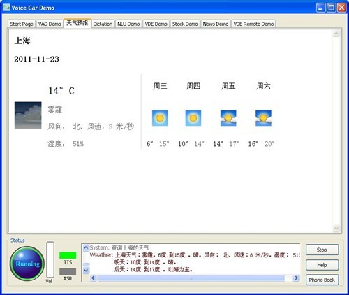 比方說(shuō)這個(gè)關(guān)于空調(diào)問(wèn)題,我們過(guò)去,空調(diào)的命令詞是“把空調(diào)打開(kāi),空調(diào)溫度提高3度!爆F(xiàn)在我也可以這樣說(shuō),空調(diào)調(diào)高一點(diǎn),我有點(diǎn)冷,也可以。就是你在車(chē)?yán)镞呁耆梢杂媚阕约旱恼Z(yǔ)言來(lái)說(shuō)你想干的事。比如說(shuō),前邊你不知道明天天氣會(huì)怎么樣,人一般都會(huì)想想,明天天氣如何,或者是告訴我天氣預(yù)報(bào)。但是你也可以這樣說(shuō)。明天會(huì)下雨嗎?也可以這樣說(shuō)。或者你這樣說(shuō),你說(shuō),今天大盤(pán)怎么樣。完全是用自然語(yǔ)言來(lái)說(shuō)。堵不堵車(chē),“查詢交通情況。”這就是,實(shí)際上可以有各種不同的說(shuō)法來(lái)完成這個(gè)任務(wù),這是我們自然語(yǔ)言的一個(gè)演示。