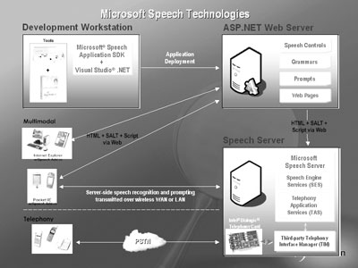 上圖中的Speech Server就是微軟的Web語音平臺(tái),可以看到它連接起了電話網(wǎng)絡(luò)(PSTN)以及Web Server。