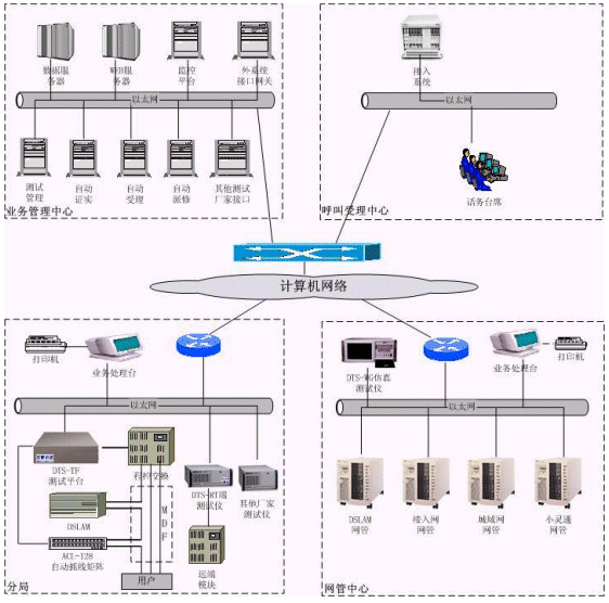 ·DTS-TF大容量測試平臺實現(xiàn)對多種不同交換機類型的外部測試及模塊局仿真測試;DTS-ADSL測試儀,實現(xiàn)ADSL開通之前的線路評估測試、ADSL開通之后的日常例行測試和ADSL故障立即測試;DTS-WG仿真測試儀,通過網(wǎng)管協(xié)議實現(xiàn)對接入網(wǎng)、LAN城域網(wǎng)、PHS小靈通等設備的故障定位;ACL-128自動抓線矩陣,提供128端口的自動抓線,級聯(lián)可達32,768條線路。