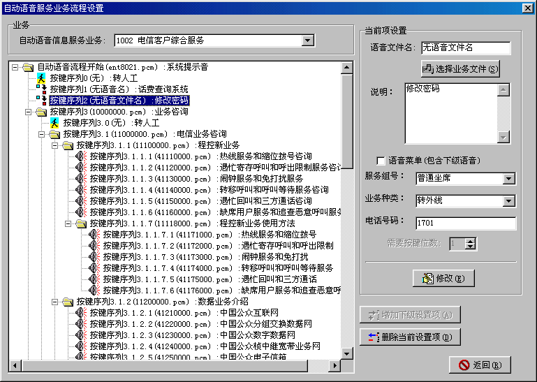 。。智能業(yè)務(wù)管理系統(tǒng)是Utron-CC2000進(jìn)行業(yè)務(wù)擴充的主要手段。用戶如需擴展新的業(yè)務(wù),主要通過智能業(yè)務(wù)管理系統(tǒng)向Utron-CC2000注冊該業(yè)務(wù);并為系統(tǒng)中的座席分配業(yè)務(wù)。根據(jù)實際業(yè)務(wù)的需求,生成相應(yīng)的系統(tǒng)信箱、業(yè)務(wù)腳本、服務(wù)項目等,來實現(xiàn)新業(yè)務(wù)的動態(tài)加載。
