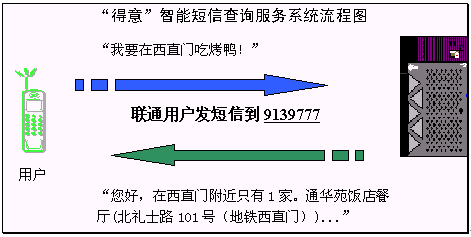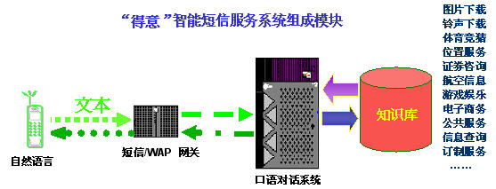 "得意"智能短信系統(tǒng)是在現(xiàn)有的數據通信和短信服務的技術平臺上,加入基于中文語言理解技術的"得意"口語對話系統(tǒng),從而能夠讓用戶在手機上以自然語言的形式享受指定領域的智能短信服務。智能短信系統(tǒng)對短信文本進行自動分析和理解,再從知識庫中提取用戶所需的信息,然后自動產生智能應答語句,并以短信文本的形式發(fā)回用戶。由于"得意"口語對話系統(tǒng)具有上下文相關理解和人機混合主導等強大功能,在規(guī)定的領域內,用戶可通過一個或者多個短信構成一組對話,完成復雜的信息查詢或者其他互動服務。