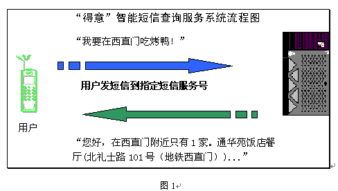 智能短信服務,就是允許短信用戶在手機上直接以自然語言的形式輸入文字(而不是輸入復雜的代碼或操作繁瑣的菜單),系統(tǒng)能迅速、準確地理解用戶的意思,提供周到的信息和服務。短信服務商可根據具體應用領域定制一系列全新的智能短信業(yè)務,如旅游交通、餐飲娛樂、金融證券、交友網聚、智力競猜等受歡迎的服務,將直接刺激用戶使用短信服務的興趣和頻率。得意公司提供的北京餐飲智能短信服務可以靈活、方便地引導用戶找到合適的餐飲信息(圖1)