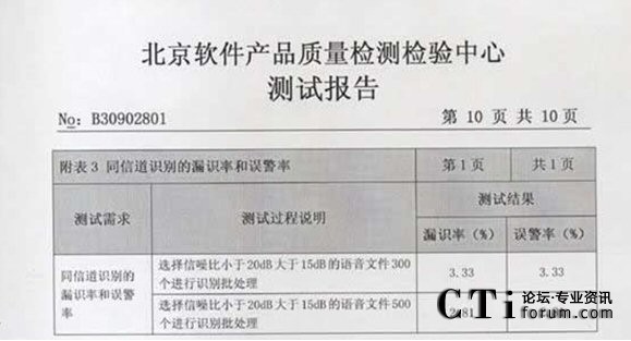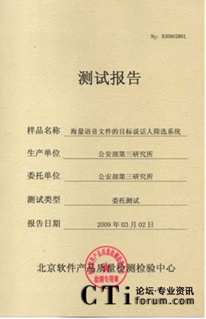 CTI論壇(ctiforum)06月25日消息: 2009年3月02-10日:北京軟件產(chǎn)品質(zhì)量檢測檢驗(yàn)中心對《海量語音文件的目標(biāo)說話人篩選系統(tǒng)》進(jìn)行了全面測試包括用戶文檔、功能性、可靠性、易用性、可維護(hù)性等多個特性。測試結(jié)果表明《海量語音文件的目標(biāo)說話 2009年3月02-10日,北京軟件產(chǎn)品質(zhì)量檢測檢驗(yàn)中心對《海量語音文件的目標(biāo)說話人篩選系統(tǒng)》進(jìn)行了全面人篩選系統(tǒng)》滿足軟件相關(guān)國家標(biāo)準(zhǔn)中的要求,系統(tǒng)在模擬測試環(huán)境中運(yùn)行正常、穩(wěn)定,正式通過北京軟件產(chǎn)品質(zhì)量檢測檢驗(yàn)中心的嚴(yán)格測試,系統(tǒng)的漏識率和誤警率分別達(dá)到了2.81%和 2.81%。