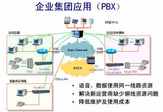 - 專網用戶通過VOIP,可組成一個大的IP PBX系統,使圖像、數據、語音通過統一網絡傳送,做到三網合一,有效利用資源,提高效率;