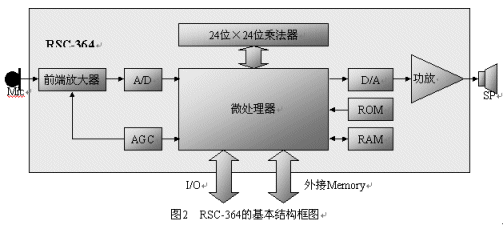 由美國(guó)Sensory Integrated Circuit公司開(kāi)發(fā),2000年開(kāi)始生產(chǎn),是一顆為消費(fèi)類(lèi)電子產(chǎn)品應(yīng)用的低價(jià)位的語(yǔ)音識(shí)別專(zhuān)用芯片,其結(jié)構(gòu)圖如圖2所示。