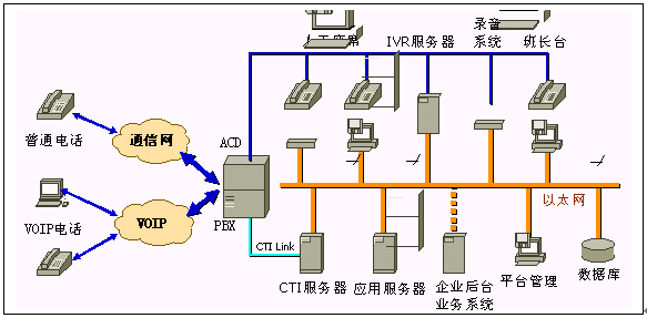 ·PBX/ACD:實(shí)現(xiàn)電話呼入、呼出和話務(wù)管理等功能,提供自動排隊(duì)機(jī)系統(tǒng),實(shí)現(xiàn)對來話的均衡分配