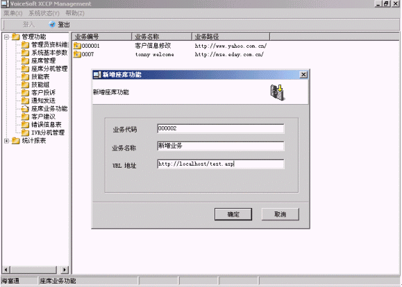 當(dāng)人工座席登陸后,XCCP Agent從系統(tǒng)數(shù)據(jù)庫加載業(yè)務(wù)菜單,每個(gè)業(yè)務(wù)菜單都對應(yīng)一個(gè)URL,當(dāng)話務(wù)員點(diǎn)擊業(yè)務(wù)菜單時(shí),系統(tǒng)就訪問對應(yīng)的URL,效果顯示在座席瀏覽器上;系統(tǒng)同時(shí)將呼叫信息或從其他座席和IVR得到的UUI信息傳送給相應(yīng)的頁面,有頁面對這些信息自行處理;菜單和URL的對應(yīng)關(guān)系由XCCP Management進(jìn)行配置;如果業(yè)務(wù)系統(tǒng)本身就是瀏覽器模式的,這樣的結(jié)構(gòu)可以將這些終端界面直接嵌入座席系統(tǒng)中,無需進(jìn)行二次開發(fā)和進(jìn)行接口定義。下面是配置界面: