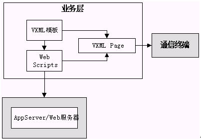 用于存放和產(chǎn)生VoiceXML腳本文檔,可以是一個(gè)文件系統(tǒng)或WEB服務(wù)器,一般文件系統(tǒng)應(yīng)用于靜態(tài)腳本,WEB服務(wù)器應(yīng)用于動態(tài)腳本;存放應(yīng)用邏輯組件或中間件,通過對后臺業(yè)務(wù)系統(tǒng)訪問,動態(tài)產(chǎn)生VoiceXML頁面,進(jìn)行事務(wù)處理