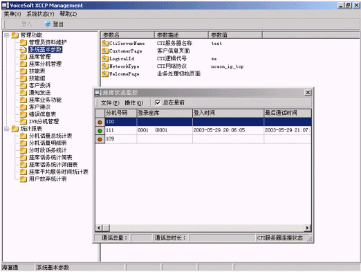 呼叫管理系統(tǒng)實(shí)現(xiàn)對呼叫中心實(shí)時(shí)狀態(tài)監(jiān)控和呼叫統(tǒng)計(jì)。系統(tǒng)管理人員依據(jù)當(dāng)前的狀態(tài)監(jiān)控顯示掌握當(dāng)前系統(tǒng)的工作狀況,如忙閑程度、業(yè)務(wù)分布、業(yè)務(wù)代表狀態(tài)、線路狀態(tài)等。領(lǐng)導(dǎo)決策人員依據(jù)對呼叫信息的歷史統(tǒng)計(jì),進(jìn)行針對性的決策,決定系統(tǒng)的規(guī)模、人員數(shù)量等的調(diào)整,以提高系統(tǒng)的運(yùn)行效率和服務(wù)質(zhì)量。