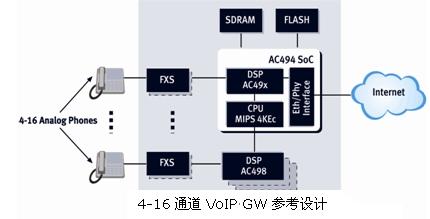 圖1:AudioCodes的片上應(yīng)用方案:4-16信道VoIP網(wǎng)關(guān)參考設(shè)計(jì)