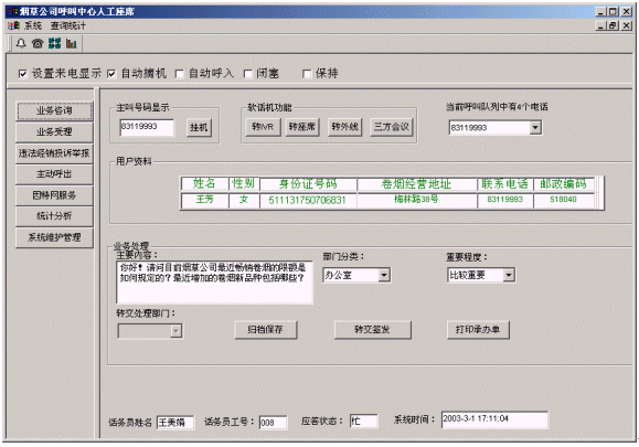 客戶打入電話后,當系統(tǒng)的自動語音應(yīng)答子系統(tǒng)無法解決客戶問題時,客戶可選擇人工服務(wù),由客戶服務(wù)代表直接接聽客戶電話,處理并解決客戶問題。此時客戶同座席話務(wù)人員直接溝通,并同時記錄下該客戶的聯(lián)系方式,將相關(guān)數(shù)據(jù)添加入系統(tǒng)數(shù)據(jù)庫;也可以在數(shù)據(jù)庫的支持下處理傳真業(yè)務(wù),電子郵件,計算機文件傳輸、滿意度調(diào)查等。