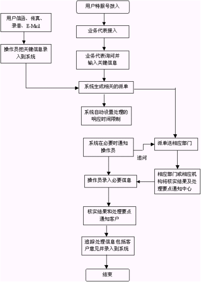 投訴舉報(bào)的受理可以自動(dòng)完成,提示用戶(hù)輸入投訴的部門(mén)和工作人員的代號(hào)。也可以人工完成,直接將投訴對(duì)象告訴話(huà)務(wù)員。