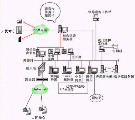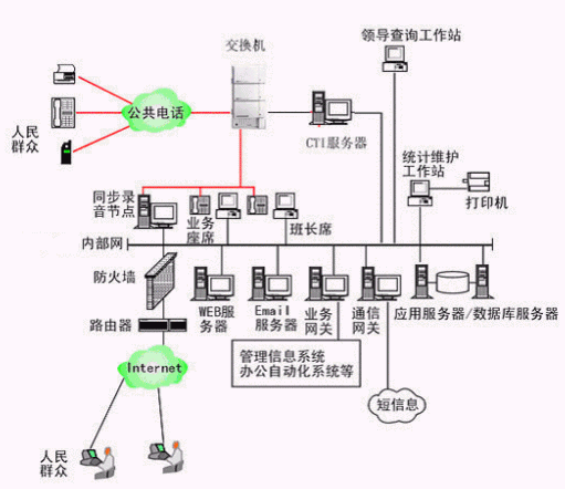 本系統(tǒng)物理結(jié)構(gòu)由排隊(duì)交換機(jī)、CTI服務(wù)器、IVR(交互式語(yǔ)音應(yīng)答)/IFR(交互式傳真應(yīng)答)服務(wù)器、業(yè)務(wù)代表座席(邏輯上分為:普通業(yè)務(wù)代表座席、專(zhuān)家座席、WEB座席等)、班長(zhǎng)座席、統(tǒng)計(jì)維護(hù)管理工作站、因特網(wǎng)(WEB)服務(wù)器、電子郵件(EMAIL)服務(wù)器、數(shù)據(jù)庫(kù)/應(yīng)用服務(wù)器、錄音留言工作站、領(lǐng)導(dǎo)查詢(xún)工作站、業(yè)務(wù)網(wǎng)關(guān)服務(wù)器、通信網(wǎng)關(guān)、網(wǎng)絡(luò)系統(tǒng)等和應(yīng)用軟件構(gòu)成。