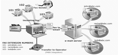 每一個(gè) e-mail地址都可以對應(yīng)一個(gè)獨(dú)立的傳真分機(jī)號(hào)碼,當(dāng)有傳真呼入時(shí),自動(dòng)地將傳真發(fā)送給指定的接收者