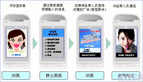 以往的IVR根據(jù)選擇項(xiàng)、層數(shù),必須多遍聽取語(yǔ)音內(nèi)容才能找到預(yù)期的菜單,成了一大課題。視頻呼叫中心則在FOMA的畫面上顯示服務(wù)菜單,通過選擇號(hào)碼可以簡(jiǎn)化聽取語(yǔ)音的過程。而且,在連接客服人員的電話等待時(shí)間中可以播放廣告。通過靈活運(yùn)用這些功能,提高了IVR的操作性,提供了新型廣告宣傳的機(jī)會(huì)。