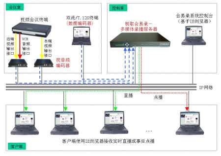 同時系統(tǒng)具備直播、點(diǎn)播功能,用戶使用IE瀏覽器即可接收會議的實(shí)時直播或進(jìn)行事后點(diǎn)播,通過直播或點(diǎn)播可同步觀看到會議中視音頻和數(shù)據(jù)內(nèi)容,觀看會議的效果如同身處會場之后。會易錄極大地擴(kuò)展了視頻系統(tǒng)的功能和應(yīng)用,適合任何已有或擬建視頻會議系統(tǒng)的用戶使用。