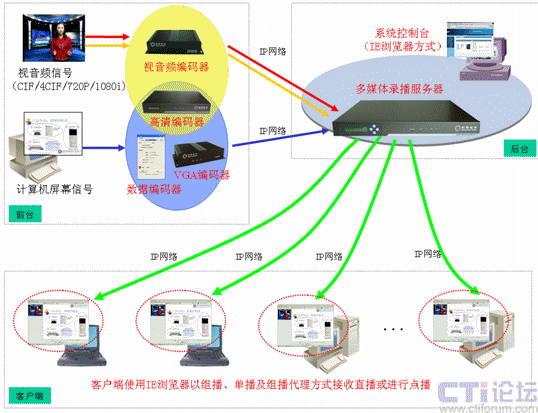 可通過單播或組播方式將會議現(xiàn)場的視頻、音頻、計算機動態(tài)屏幕在網(wǎng)絡(luò)上進行實時直播,用戶可通過IE瀏覽器登錄服務(wù)器實時接收直播的視頻、音頻和計算機動態(tài)屏幕內(nèi)容。系統(tǒng)獨家支持組播代理功能,無須更改網(wǎng)絡(luò)設(shè)備的設(shè)置即可實現(xiàn)跨網(wǎng)段的組播。系統(tǒng)獨家支持文件組播功能,可將錄制好的文件在網(wǎng)絡(luò)上再次進行組播。
