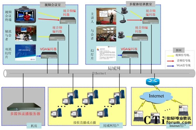 銳取多媒體錄播系統(tǒng)采用了分布式的架構(gòu),前端的視音頻編碼器負(fù)責(zé)視音頻信號的采集,后臺的多媒體錄播服務(wù)器負(fù)責(zé)信號的錄制、直播和點(diǎn)播。多媒體錄播系統(tǒng)可從視頻會議終端上獲取信號,并將視頻會議實時直播到?jīng)]有視頻會議終端覆蓋的分行,擴(kuò)大了視頻會議的參與范圍,讓更多的員工可以參加遠(yuǎn)程培訓(xùn)。