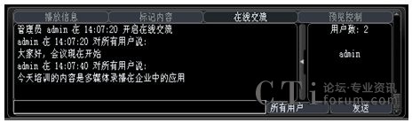 系統(tǒng)增加了多方文字互動交流功能,在線交流功能可以選擇給所有人員發(fā)送消息,也可以選擇給某一特定人員發(fā)送。這樣在會議或培訓(xùn)的過程中,管理員可以選擇性的提出相應(yīng)的問題給相關(guān)人員,考核相關(guān)人員的培訓(xùn)效果;其他人員也可以將會議或培訓(xùn)過程中遇到的疑問、難點(diǎn)及時的反應(yīng)給管理員進(jìn)行解答,增強(qiáng)會議或培訓(xùn)的成效。